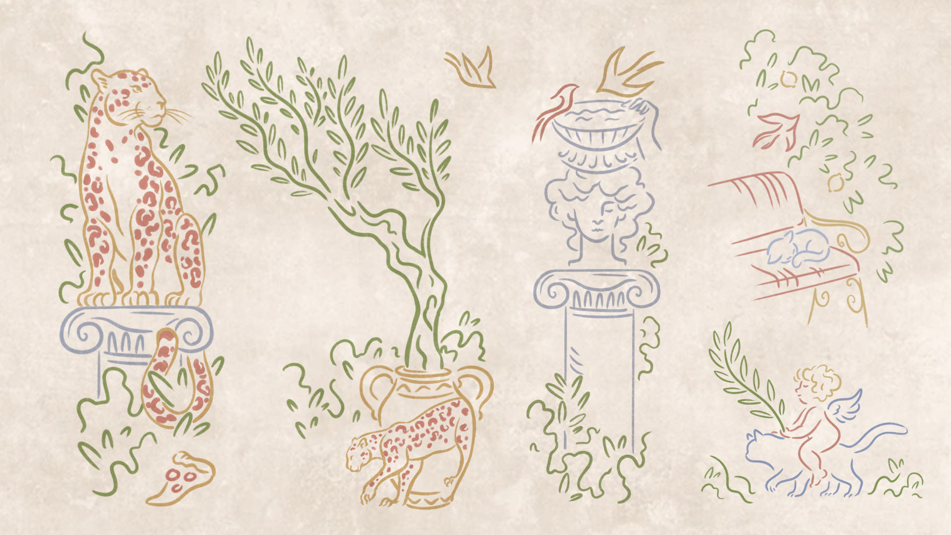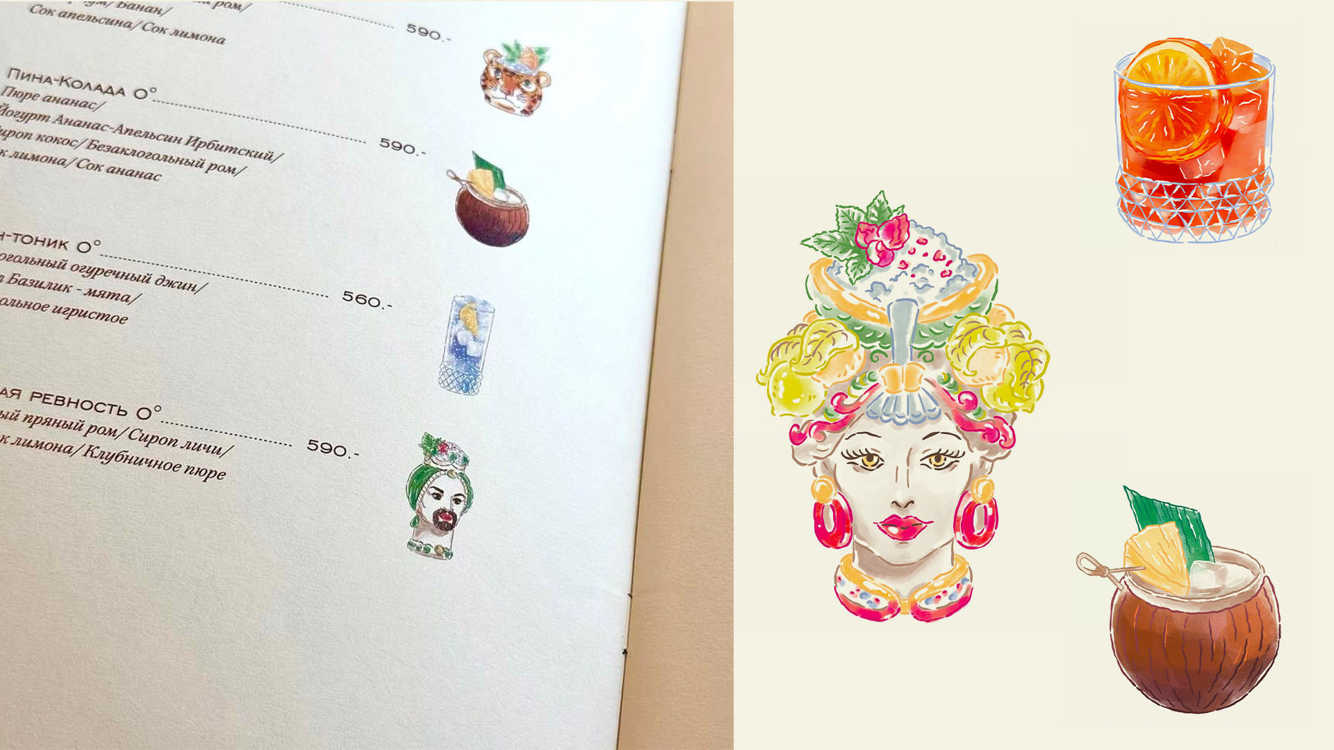 Se desarrolló un conjunto de elementos visuales que incluyen ilustraciones murales para diferentes zonas del restaurante, realizadas en un estilo minimalista y clásico, inspirado en los frescos italianos tradicionales. Además, se crearon ilustraciones para el menú y un patrón textil utilizado en el diseño interior, manteniendo una estética luminosa, elegante y atemporal.